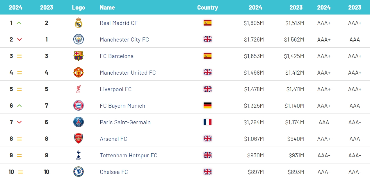 皇马18亿登顶品牌价值榜 曼城巴萨挤进前3