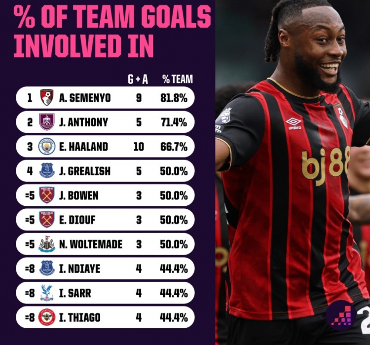 在这个赛季,伯恩茅斯的边锋塞梅尼奥简直就像是球队进攻的发动机,他的状态火热得令人发指,简直无人能敌!根据OPTA的统计,塞梅尼奥参与的进球竟占到了球队总进球的81.8%,这简直就是英超的奇迹,难怪球队上下都对他赞不绝口。