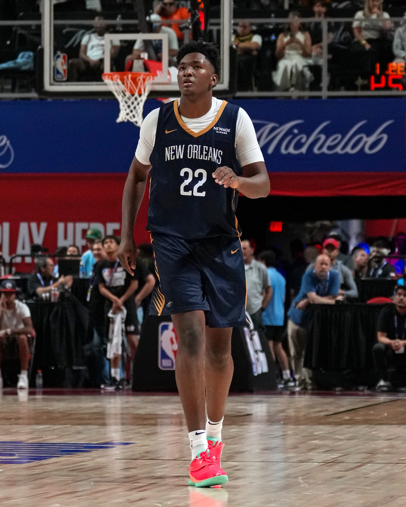作为今年的13号新秀,奎因身高2米08,浑身都是力量与速度的代名词。他在夏季联赛中出战的三场比赛里,居然豪气冲天地以场均27.1分钟上场时间,砍下了14.0分11.0篮板2.3助攻1.0盖帽的豪华数据,还展现了他投篮的潜力—43.8%的投篮命中率搭配50.0%的三分球命中率,可谓一夜成名。而72.2%的罚球命中率则像是在提醒他,别忘了在关键时刻还是需要冷静的心态。