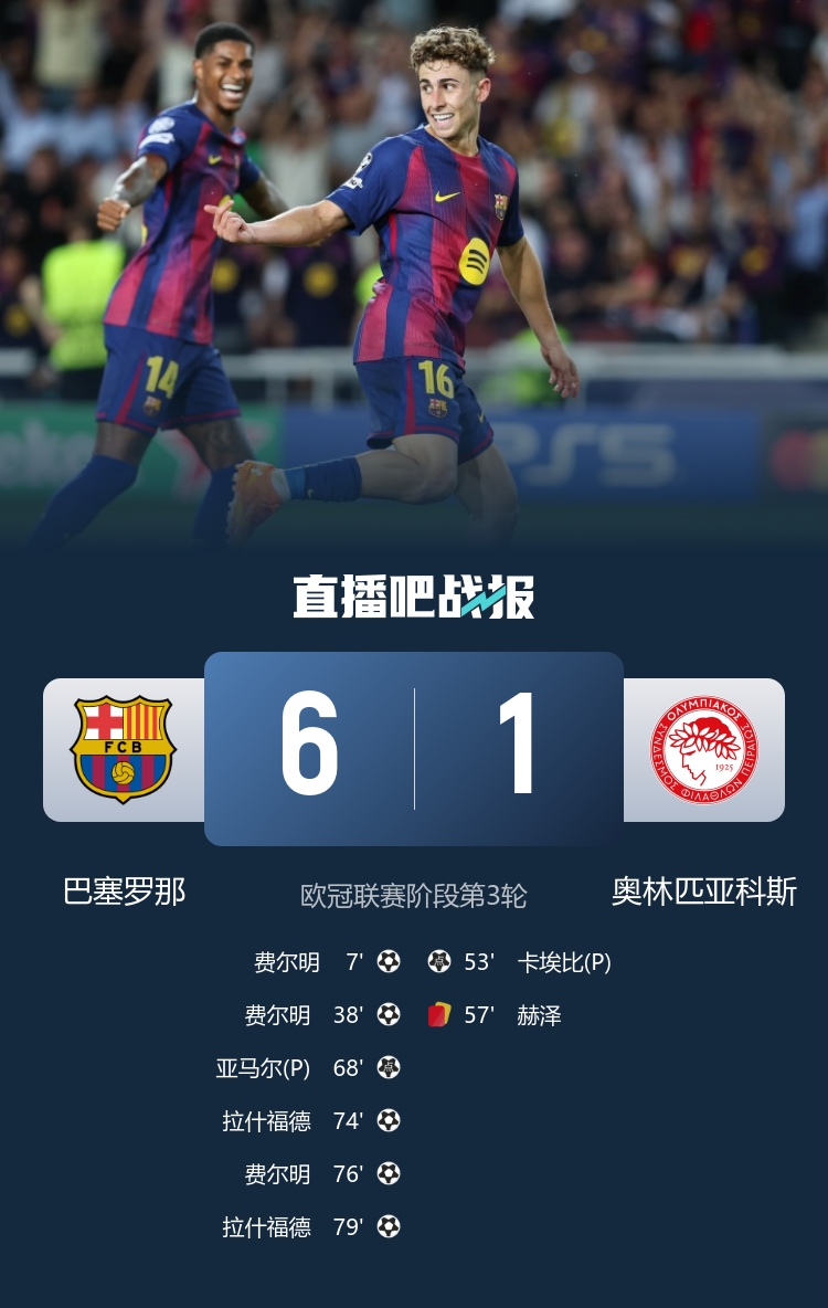 巴萨以六球大胜十人奥林匹亚科斯 费尔明梅开二度拉什福德双响赫泽红牌引发争议_欧冠足球直播