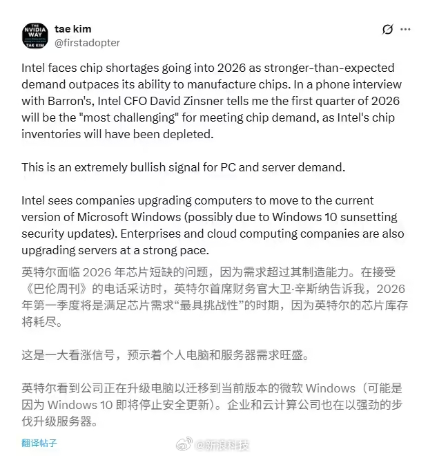 10月24日讯,今天,我们从英特尔的首席财务官大卫・津斯纳的话语中感受到了颇为严峻的市场形势。在接受《巴伦周刊》的采访时,他毫不掩饰地透露,随着服务器和个人电脑处理器需求不断攀升,公司的芯片库存正在以前所未有的速度消耗殆尽。我们面临着一种前所未有的局面,数据中心和客户端的 CPU 需求飙升,而2026年第一季度将成为检验这股需求压力的最艰巨时刻,库存可能在那时见底。