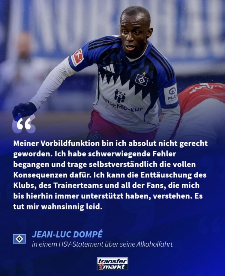 这并非多姆佩在汉堡效力期间的首次交通违法行为。早在2023年,他便因超速驾驶导致事故,撞上了一个公交车站。当时,汉堡检察院对他进行过逃逸调查,俱乐部针对这一事件也对其处以了“严厉”的罚款。