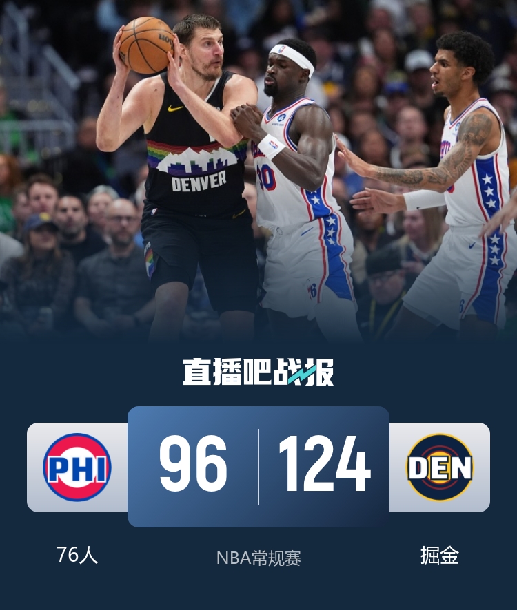 掘金战胜76人 约基奇三节贡献8分7篮板14助攻 布劳恩27分钟砍下22分 VJ射门12投仅中3_NBA直播