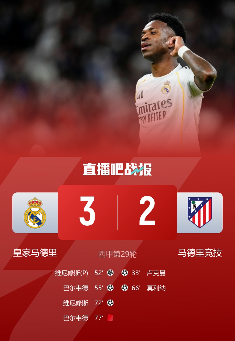 3月23日讯 北京时间凌晨4点,2025-26赛季西甲联赛第29轮迎来了焦点战役,皇家马德里在伯纳乌球场对阵马德里竞技。比赛上半场,巴尔韦德的一脚射门击中了门柱,卢宁的脱手险些让对方得手。随即卢克曼抓住机会为马竞打破僵局,皇马在半场结束时以0-1落后;下半场,布拉欣·迪亚斯在禁区内制造了点球,维尼修斯主罚点球成功帮助皇马扳平,随后巴尔韦德利用对方的失误再下一城,带领皇马反超。但没过多久,莫利纳的世界波又将比分扳平,然而维尼修斯随后再次破门,皇马再次领先。比赛末段,巴尔韦德因犯规被红牌罚下,但最终皇马以3-2战胜马竞,取得各项赛事五连胜,距离积分榜首位置仅有4分的差距。